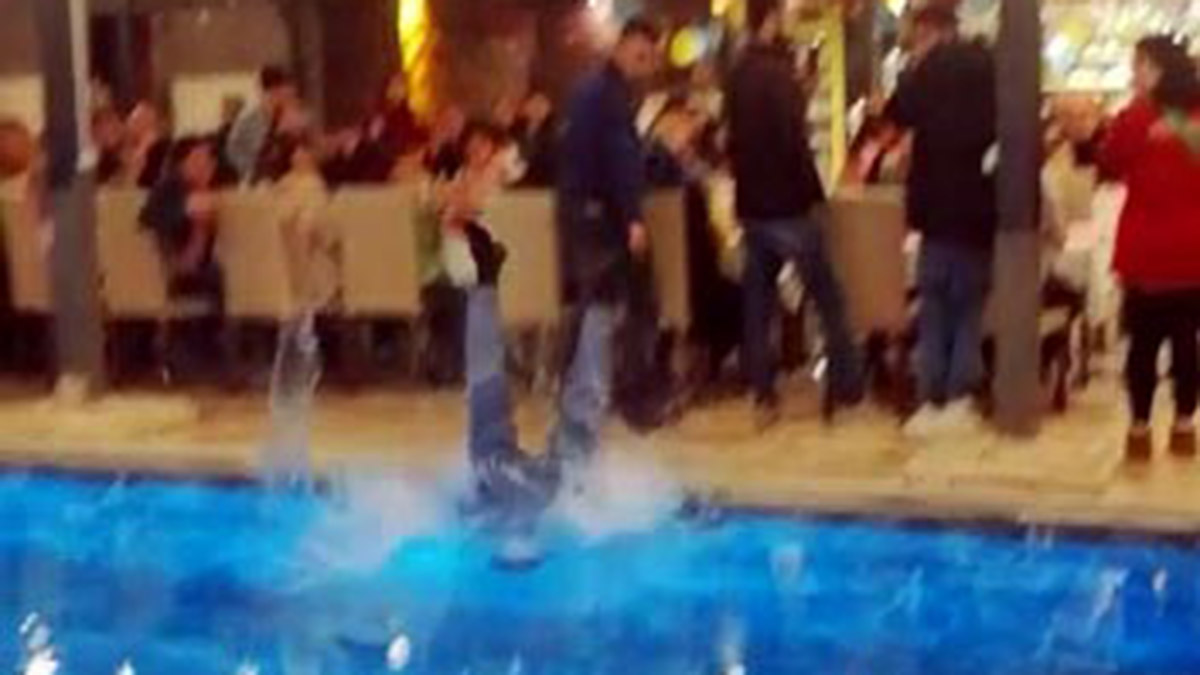 Aydın’ın Kuşadası ilçesinde depremzedelere moral gecesinde sahneye doğru yürürken ayağı zemine takılan türkücü Mustafa Keser, dengesini kaybedip havuza düştü. Keser, üzerine değiştirdikten sonra sahneye çıktı.