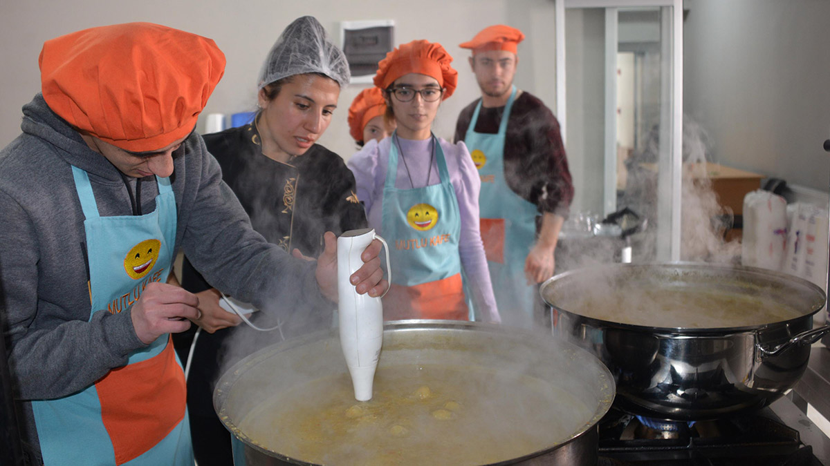 Erzurum’da 2021 yılında Milli Eğitim Müdürlüğü Palandöken Özel Eğitim Meslek Okulu bünyesinde özel gereksinimli çocukların sosyal hayata katılmalarını sağlamak amacıyla ‘Mutlu Kafe’ açıldı. ‘Üreten Çocuklar’ sloganıyla hizmete giren ve çalışanlarının özel gereksinimli çocuklardan oluştuğu Mutlu Kafe, gelenlere hizmet veriyor. Döner sermaye kazancıyla ücret de verilen çocuklar, Kahramanmaraş merkezli meydana gelen 2 büyük depremin ardından yardım için kolları sıvadı. Depremin vurduğu 10 ilin yiyecek ihtiyacını karşılamak isteyen çocuklar, günlük 200 kişilik çorba pişirerek suretiyle çalışmalara destek olmak istedi.
