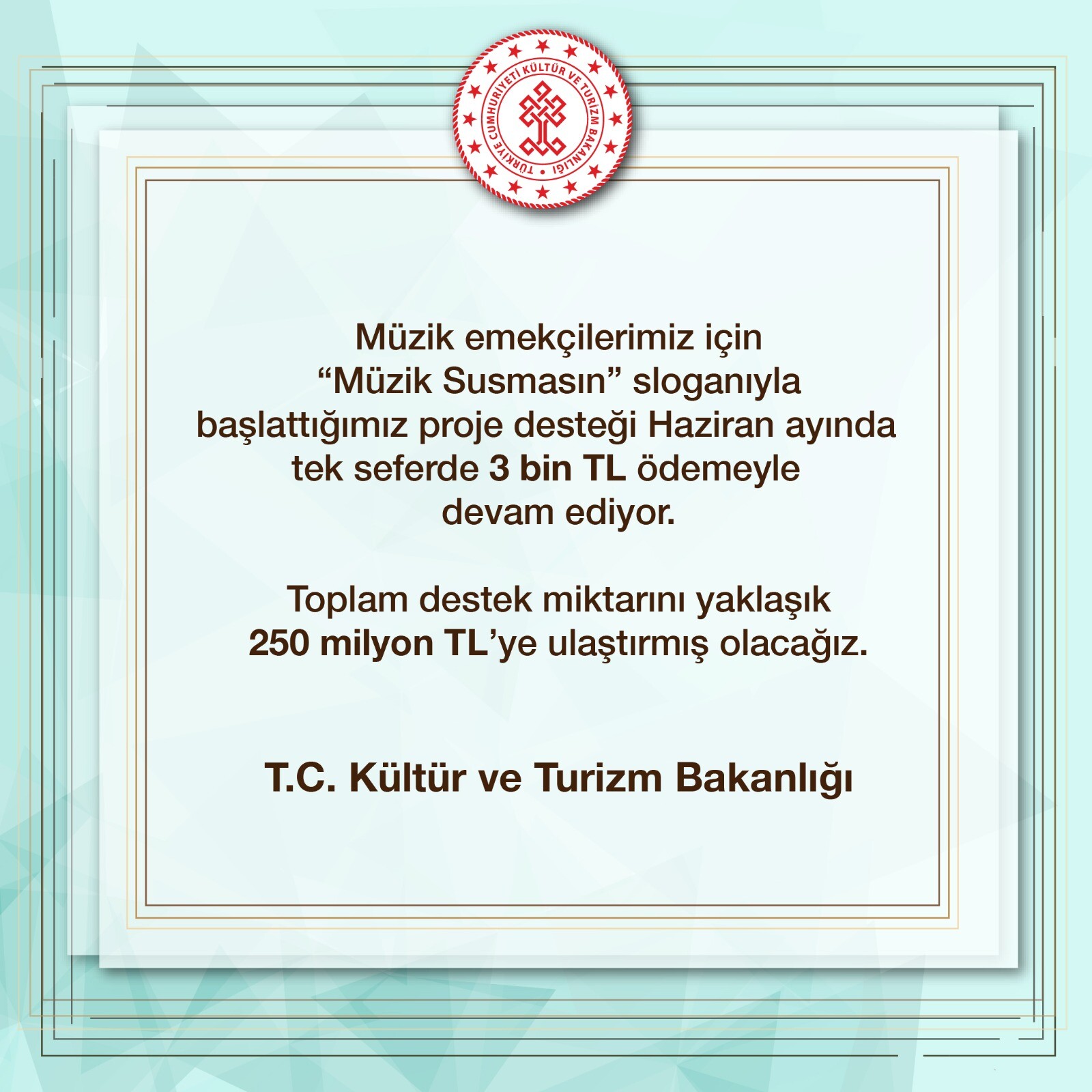 Kültür ve Turizm Bakanlığı Twitter hesabından yapılan açıklamada ‘Müzik Susmasın’ sloganıyla müzik emekçilerine 3 bin TL destek verileceği belirtildi. Yapılan açıklamada “Müzik emekçilerimiz için ‘Müzik Susmasın’ sloganıyla başlattığımız proje desteği Haziran ayında tek seferde 3 bin TL ödemeyle devam ediyor. Toplam destek miktarını yaklaşık 250 milyon TL’ye ulaştırmış olacağız” denildi.