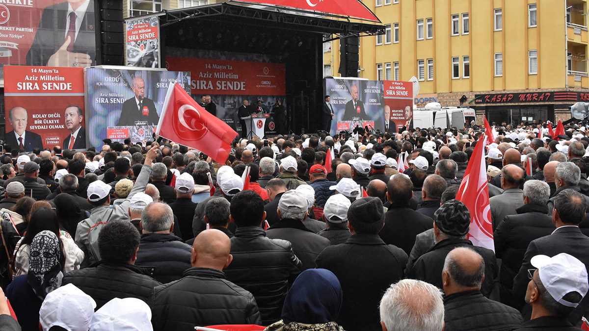MHP Genel Başkanı Devlet Bahçeli, seçim çalışmaları kapsamında geldiği Ordu’da, ‘14 Mayıs’ta Aziz Milletim Sıra Sende’ adlı mitinge katıldı. Cumhuriyet Meydanı’nda düzenlenen mitingde vatandaşlara seslenen Bahçeli, 3 gün sonra yapılacak olan Cumhurbaşkanlığı ve 28’inci Dönem Milletvekilliği Genel Seçimlerinin ülkenin dirliğine, milletin birliğine, demokrasinin geleceğine, insanların huzur ve refahına hayırlı ve kalıcı sonuçlar getirmesini temennisinde bulundu.