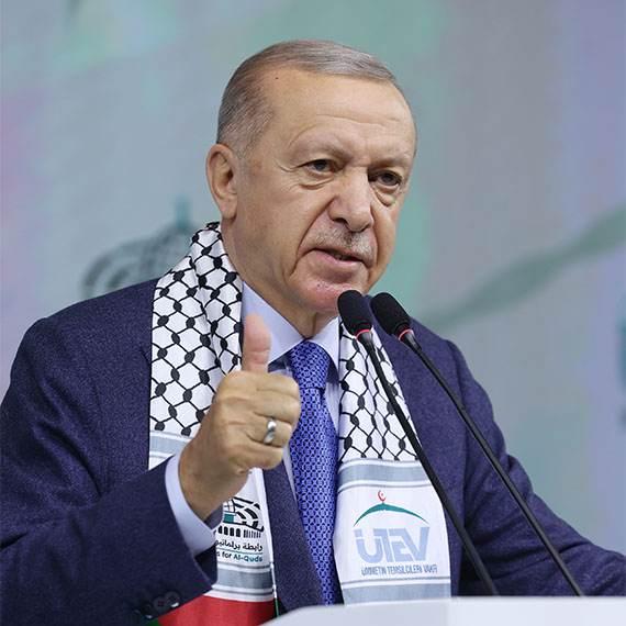 Cumhurbaşkanı Erdoğan, “Biz şartlara göre, esen rüzgara göre, konjonktüre göre sözünü, duruşunu, tavrını belirleyen tatlı su siyasetçilerinden değiliz. Biz bu yola kefenimizi giyerek çıktık. Bu kutlu yola ömrümüzü adadık. Yarım asırlık siyasi hayatımız boyunca bedel ödemekten asla çekinmedik. Biz birilerine şirin gözükmeksizin değil Filistin bir sınav kağıdı her mümin kulun önünde diyen merhum Cahit Sarifoğlu’nun ifadesinde anlamını bulan o ağır imtihanı hakkıyla vermenin derdindeyiz. Kimse kusura bakmasın. Tüm imkansızlıklara rağmen Filistinli kardeşlerimiz tam 203 gündür tek başlarına direnirken yalnız başlarına tüm insanlığın onurunu savunurken hiç kimse bizden soykırıma sessiz kalmamızı bekleyemez.