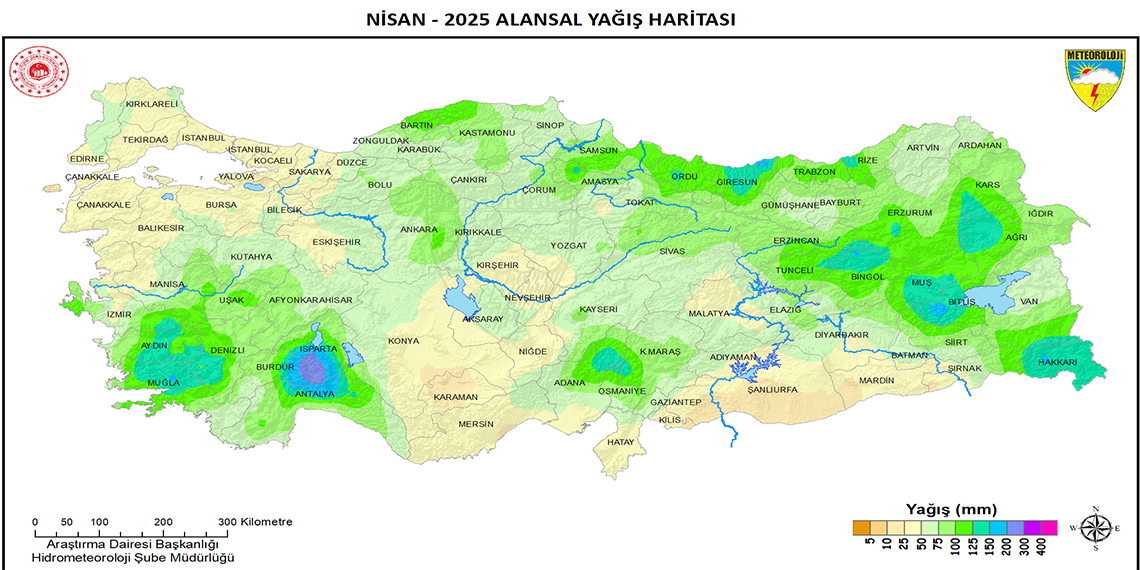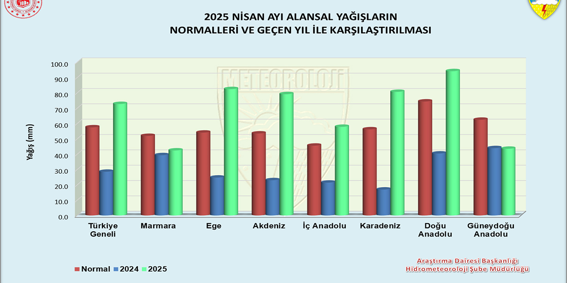 Meteoroloji’nin 2025 yılı Nisan ayı yağış raporuna göre ise Türkiye genelinde nisan ayında metrekarede ortalama 72,7 kg yağış kaydedildi. Nisan ayı uzun yıllar 1991-2020 normalleri 57,5 kg iken, bu nisan ayında normalin yüzde 27 üzerinde artış yaşandı. 28,5 kg olan 2024 yılı Nisan ayına göre ise yağışlardaki artış yüzde 155’e ulaştı.