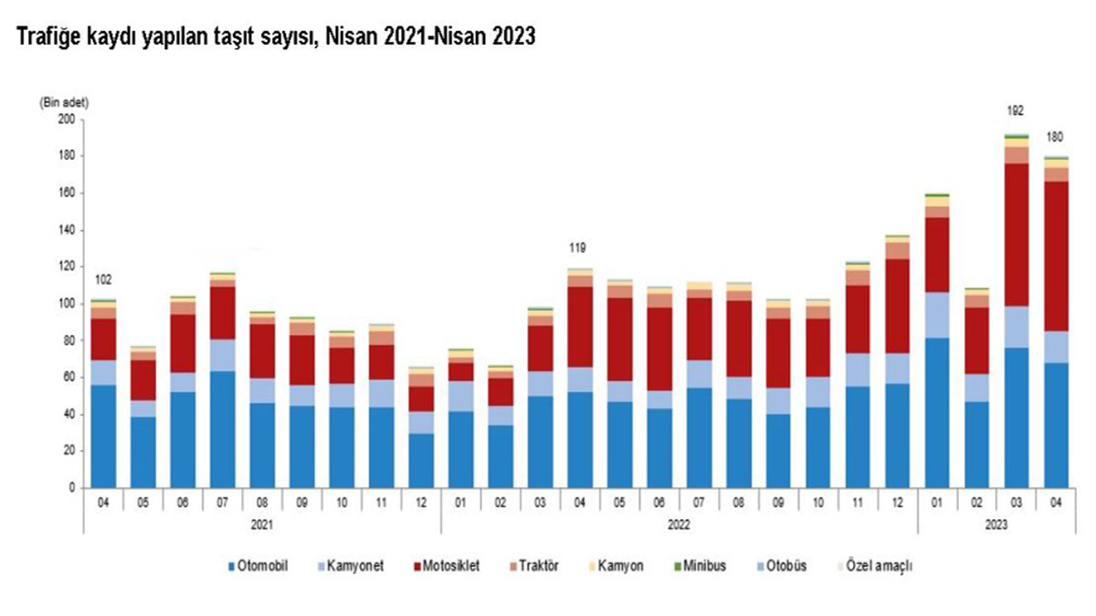 TÜİK, Nisan 2023’e ilişkin motorlu kara taşıtları istatistiklerini açıkladı. Buna göre; nisan ayında 179 bin 504 taşıtın trafiğe kaydı yapıldı. Taşıtların yüzde 45,2’sini motosiklet, yüzde 37,7’sini otomobil, yüzde 9,8’ini kamyonet, yüzde 4,2’sini traktör, yüzde 2,1’ini kamyon, yüzde 0,5’ini minibüs, yüzde 0,4’ünü otobüs ve yüzde 0,1’ini özel amaçlı taşıtlar oluşturdu.