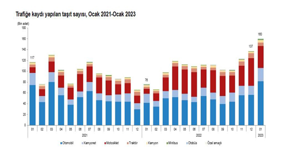TÜİK, Ocak 2023 dönemine ilişkin motorlu kara taşıtları istatistiklerini açıkladı. Buna göre, ocak ayında 160 bin 162 taşıtın trafiğe kaydı yapıldı. Taşıtların yüzde 50,8’ini otomobil, yüzde 25,3’ünü motosiklet, yüzde 15,5’ini kamyonet, yüzde 3,9’unu traktör, yüzde 3,2’sini kamyon, yüzde 0,8’ini minibüs, yüzde 0,3’ünü otobüs ve yüzde 0,2’sini özel amaçlı taşıtlar oluşturdu.