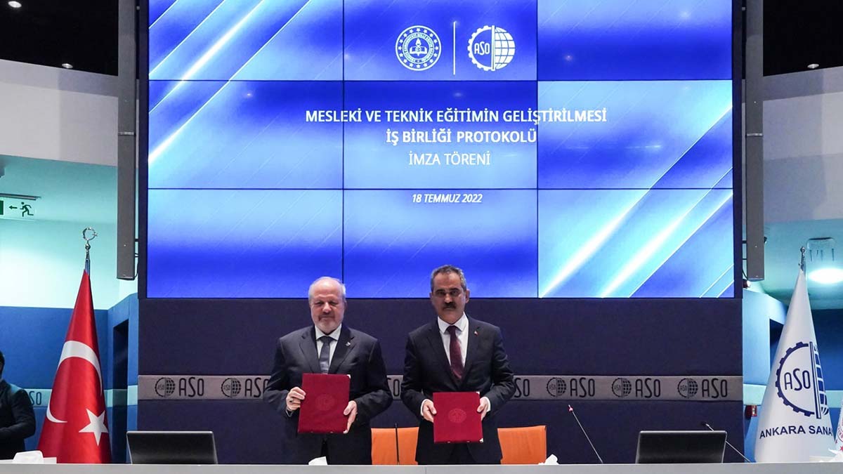Milli Eğitim Bakanlığı ile Ankara Sanayi Odası (ASO) arasında ‘Mesleki ve Teknik Eğitimin Geliştirilmesi İş Birliği Protokolü’ imzalandı. ASO’da gerçekleştirilen törene Milli Eğitim Bakanı Mahmut Özer, Ankara Valisi Vasip Şahin, Savunma Sanayii Başkanı İsmail Demir, ASO Yönetim Kurulu Başkanı Nurettin Özdebir, Ankara Ticaret Odası (ATO) Başkanı Gürsel Baran, milletvekilleri ve davetliler katıldı.