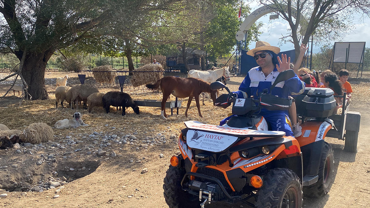 Veteriner hekim Laçinbala, “Resmi açılışı 19 Kasım 2022’de planladığımız HAYTAP Emekli Hayanlar Çiftliği 4 Ekim Hayvanları Koruma Günü dolayısıyla merkez ilk ve ortaokullardan yoğun ilgi gördü. Randevu alan okullardan gelen 1800 öğrenci tesis içerisinde ATV araçlarımız ile tur atıldıktan sonra evlerinden getirmiş oldukları bayat ekmekleri merkezdeki havuza atarak ördekleri beslediler. Hayatlarında ilk defa bir eşeği yakından gören öğrencilere ağaçlar altındaki doğal derslikte hayvan hakları konusunda kısa bilgilendirmeler yapıldı” dedi.