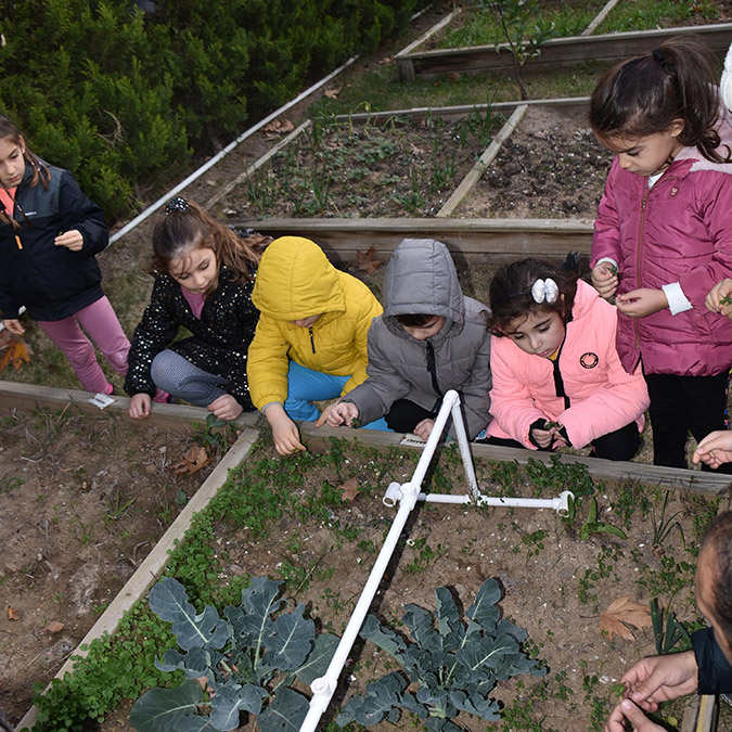 Çocuklar için oluşturulan tarım havuzlarından söz eden Güldoğan, “Her sınıfımızın ‘kırmızı, sarı, yeşil’ gibi farklı renklerde tarım havuzları var. Burada sebze yetiştiriyorlar. Lahana, marul, roka, soğan, havuç, çilek, maydanoz gibi ürünler yetiştiriyorlar. Bunları yemekhanemizde salata ve yemeklere ekliyoruz. Bir de kompost alanımız var. Her aile evinde bir kompost kutusu oluşturdu. İçine yeşil sebze kabukları biriktiriyorlar. Çocuklar, bunu kompost ünitelerine atıyor. Bunlar gübreye dönüşüyor ve ürün yetiştirdikleri topraklarda kullanıyorlar” dedi.