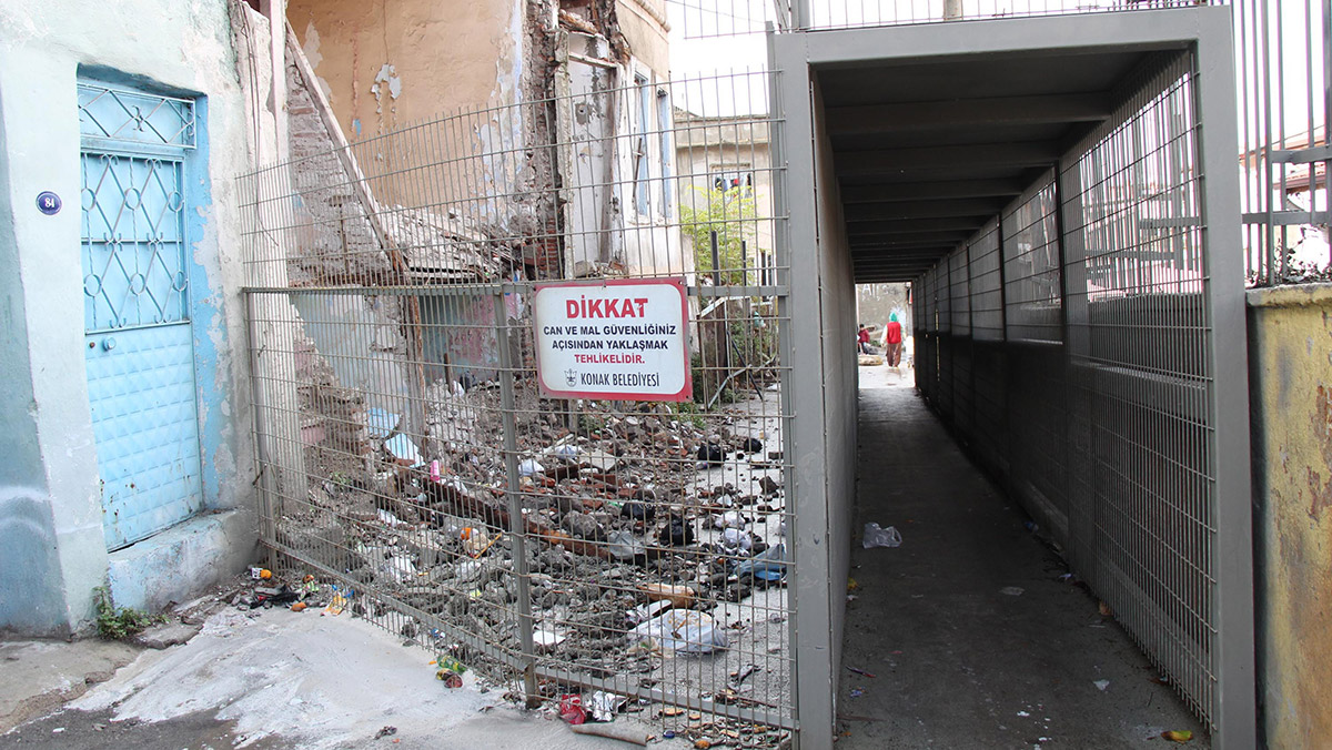 Mahalle sakinlerinin başvurusuyla Konak Belediyesi’nce bir süre kullanıma kapatılan sokağa, çelik konstrüksiyon ile tüp geçit yapıldı. Hasarlı binanın girişleri de demir parmaklıklarla kapatıldı. Yıkılma tehlikesi devam eden metruk binanın bulunduğu sokak ise yeniden kullanıma açıldı.