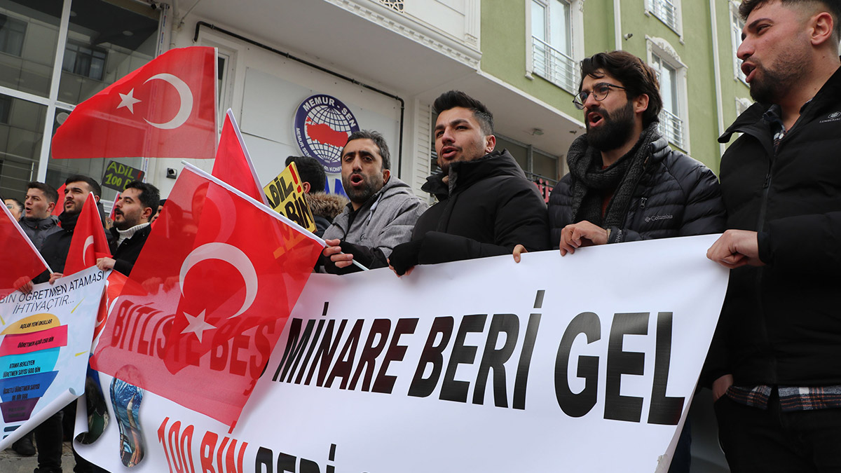 Öğretmen adayları, ‘100 bin atama’ talebiyle İskele Caddesi’nde bulunan Memur-Sen Van İl Temsilciliği binası önünde basın açıklaması yaptı. Saygı duruşunu ardından İstiklal Marşı’nı okuyan öğretmen adayları, ellerindeki Türk bayrakları ve 100 bin öğretmen ataması istediklerini belirten pankarlarlar yürüdü. Van, Bitlis, Şırnak, Bingöl, Kars, Ağrı, Hakkari, Muş, Diyarbakır, Trabzon, Şanlıurfa, Erzurum ve Malatya’dan gelen yaklaşık 150 öğretmen adayının katıldığı basın açıklamasına Memur-Sen Van İl Temsilcisi Mehmet Ali Uca da destek verdi.
