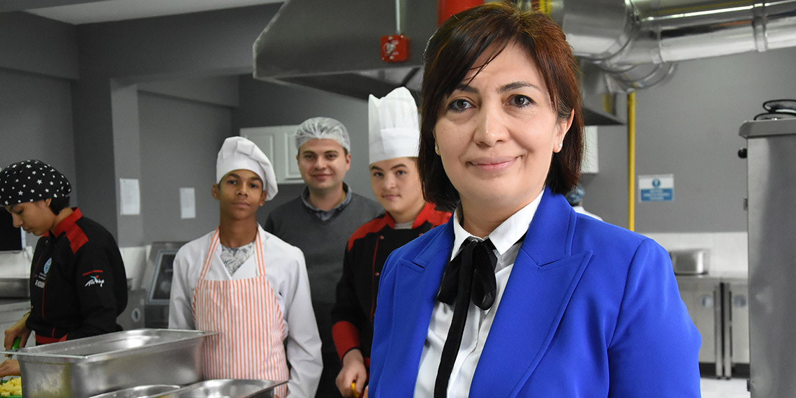 Okulun hafif düzeyde zihinsel engele sahip öğrencilere eğitim verdiğini ifade eden okul müdürü Mehtap Kınalıbaş, “Öğrencilerimize mesleki eğitim veriyoruz. Öğrencilerimizin ürettikleriyle, yapabildikleriyle ön planda olmalarını, güçlü yönleriyle öne çıkmalarını arzu ediyoruz. Öğrencilerimiz burada yedikleri yemeği hazırlıyor. Bunun öncesinde farklı kurumlardan yemek hizmetini satın alıyorduk. Ama çocuklarımızın memnuniyetsizliği oluyordu. Burası bir üretim okulu olduğu için yiyecek içecek hizmetleri alanı var. Şu an yedikleri yemeği üretiyorlar. Ayrıca 2 özel eğitim okulumuza da yemek hizmeti sunuyoruz. Daha da geliştirmeyi, 6 okula hizmet sunmayı düşünüyoruz. Burada 1000 kişilik yemek üretecek kapasitemiz var” dedi.