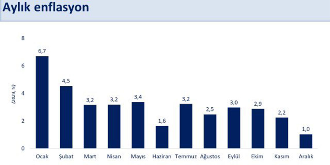Hazine ve Maliye Bakanı Mehmet Şimşek, aralık ayı enflasyon verilerine ilişkin, soysal sosyal medya hesabından yaptığı açıklamada, “Vatandaşımızın geçim sıkıntısını çözmek en büyük önceliğimizdir. Bu doğrultuda gerekli politika çerçevesini oluşturduk ve dezenflasyon programını kararlılıkla uygulamaya devam ediyoruz. Aralık ayında enflasyon son 19 ayın en düşük seviyesinde yüzde 1 oldu. Yıllık enflasyon yüzde 44,4’e gerileyerek 2023 yılı Kasım ayında açıklanan Merkez Bankası tahmin aralığının 2,4 puan üzerinde gerçekleşti. Böylece 2024 yılında enflasyon 2022 ve 2023 yıl sonuna göre 20 puan düştü. Enflasyondaki düşüş sürecek. Maliye politikasının artan desteğinin yanı sıra hizmet enflasyonundaki katılığın azalması ve beklentilerdeki iyileşme ile 2025 yılında enflasyonun hedefimiz doğrultusunda gerçekleşmesini bekliyoruz” dedi.