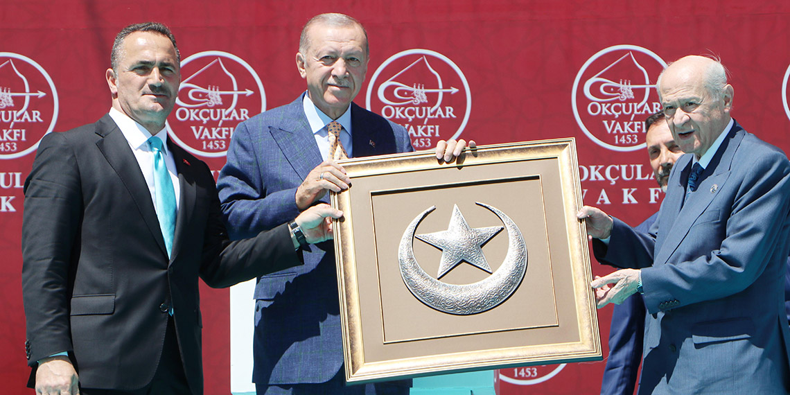Törende Okçular Vakfı Başkanı Haydar Ali Yıldız, Cumhurbaşkanı Erdoğan’a yay, MHP Genel Başkanı Devlet Bahçeli’ye de ay yıldız motifli tablo hediye etti. Erdoğan, törene katılan protokol üyelerini kürsüye davet edip fotoğraf çektirdi. Diyanet İşleri Başkanı Ali Erbaş’ın dualarıyla tören sona erdi.