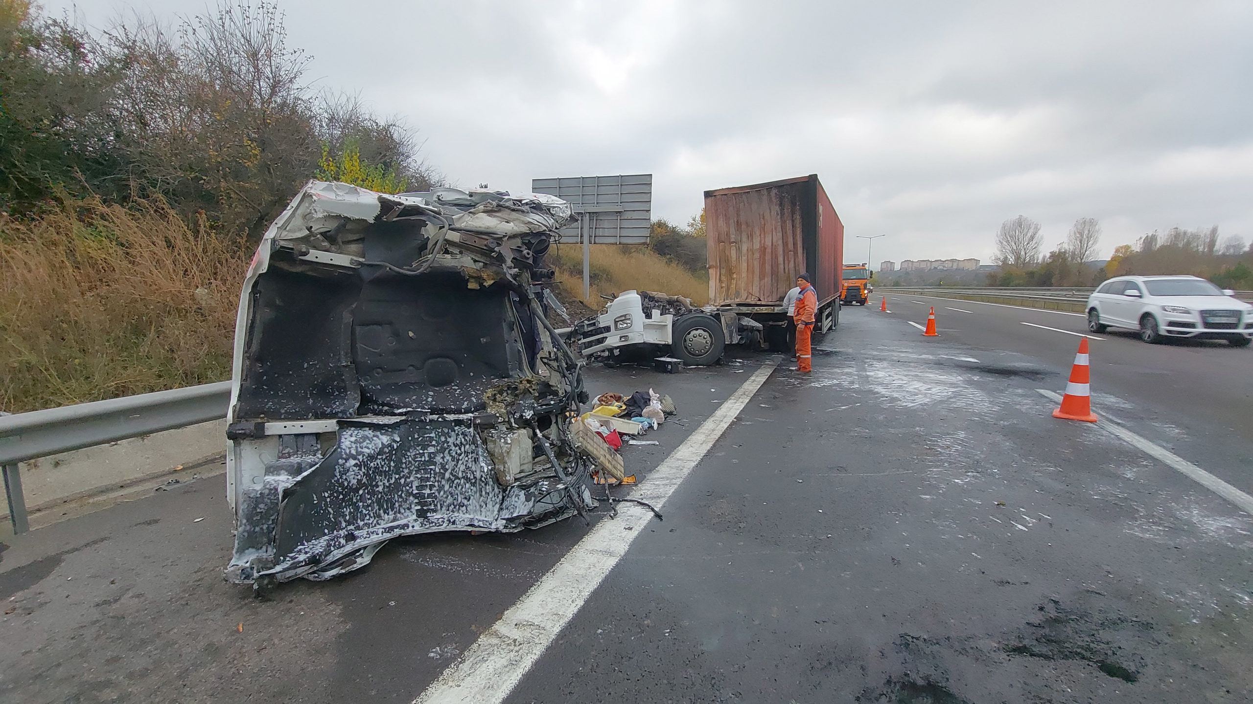 Kaza, saat 08.00 sıralarında TEM Otoyolu’nun Ağaççılar mevkisinde meydana geldi. Ankara yönüne giden sürücüsünün ismi öğrenilemeyen 34 JZ 2494 plakalı TIR, Ali Peker yönetimindeki tomruk yüklü 81 ABJ 581 plakalı TIR’a arkadan çarptı.