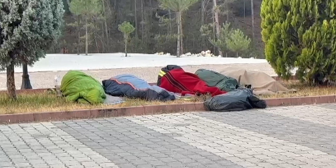 Bölgede yangın, gün ağarınca görüntülenirken, çevre illerden desteğe gelen ekipler, uyku tulumlarıyla birlikte kaldırımda uyudu.