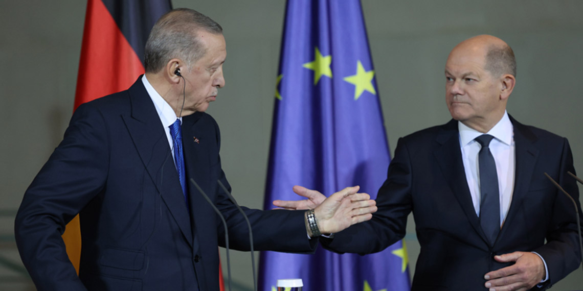 Cumhurbaşkanı Recep Tayyip Erdoğan, Almanya Başbakanı Olaf Scholz ile baş başa görüşme ve heyetler arası çalışma yemeği öncesinde ortak basın toplantısı düzenledi. Cumhurbaşkanı Erdoğan, Başbakanlık binasına gelişinde kendisini karşılayan Almanya Başbakanı Scholz ile tokalaştı ve basın mensuplarına poz verdi.