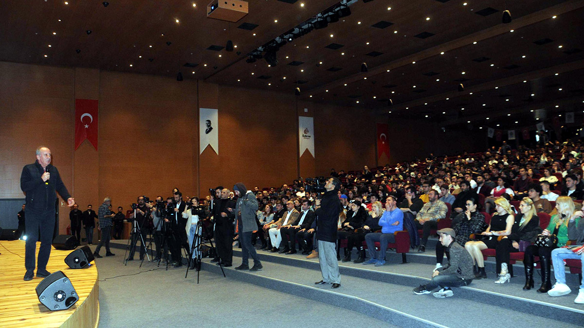 Memleket Partisi Genel Başkanı İnce, Kırklareli’nin Lüleburgaz ilçesinde vatandaşlarla bir araya geldikten sonra partisinin Edirne İl Başkanlığınca düzenlenen ‘Gençlerle Buluşma’ programına katıldı. Edirne Belediyesi Atatürk Kültür Merkezi’nde düzenlenen buluşmada konuşan İnce, özellikle 6’lı masa, mülteciler ile Ekrem İmamoğlu hakkında verilen kararla ilgili değerlendirmede bulundu.