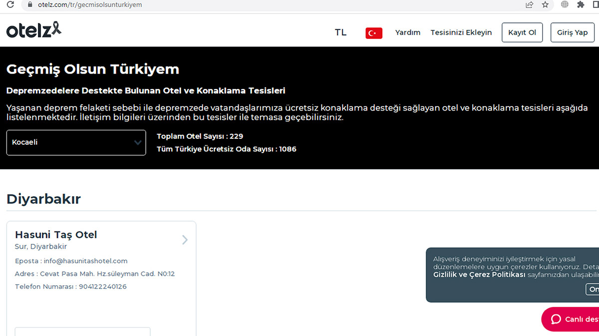 Deprem felaketi nedeniyle, depremzedelerin barınma ihtiyaçlarının karşılanmasına yönelik internet üzerinden de ‘https://www.otelz.com/tr/gecmisolsunturkiyem’ isimli internet sitesi oluşturuldu. Özellikle deprem bölgesindeki iller ve yakın çevresindeki oteller olmak üzere Türkiye genelinde çok sayıda otel, depremzedelere ücretsiz konaklama hizmeti vermek için internet sitesine üye oldu. Site üzerinde ücretsiz hizmet verecek oteller isimleriyle yer alıyor. İnternet sitesine kısa sürede 200’ün üzerinde otel ücretsiz barınma imkanı sunmak için üyelik oluşturdu ve ayrılan oda sayısı da 1000’i aştı. İnternet sitesinde kampanyaya katılan tüm oteller illere göre sıralanıyor.