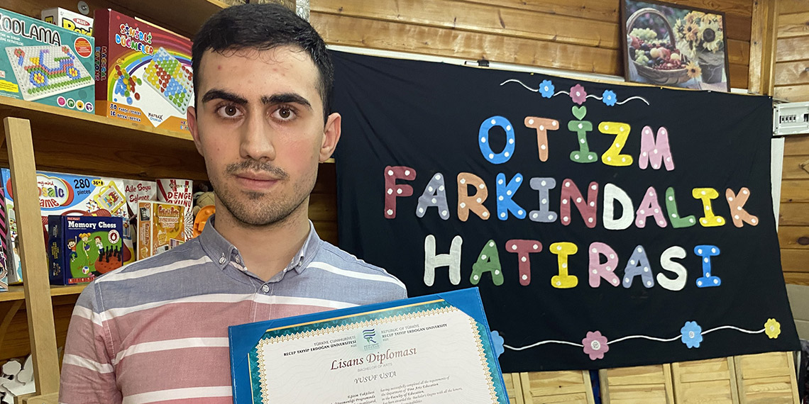 Rize’de otizmli Yusuf Usta (23), özel yetenekle girdiği Recep Tayyip Erdoğan Üniversitesi (RTEÜ) Resim İş Öğretmenliği Bölümü’nden mezun oldu. Öğrencilerine öğretmenlik yapacağı günün hayalini kuran Usta, “Hayallerimi tuvale çizerek, bugüne geldim” dedi.