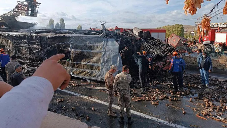 Otobüs, Emrah Solmaz ve Eşref Tutak’a, ardından da önüne çıkan TIR’a çarptı. Karşı şeride geçen otobüs, yan yatan kamyonun kaldırılmasında çalışan kepçeye, ardından da kamyona çarptı. Kazayla birlikte otobüs, TIR ve kamyon alev aldı. Alevlerin sardığı otobüsteki bazı yolcular camlardan atlayarak kurtuldu.