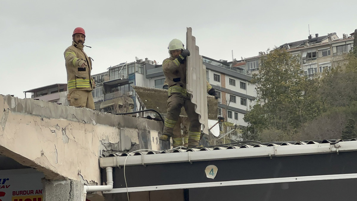 İhbar üzerine olay yerine itfaiye ekipleri sevk edildi. İtfaiye ekipleri çevrede önlem alırken çatıya çıkan ekipler, yerinden oynayan çatı parçalarını aşağıya indirdi.