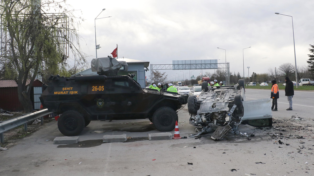 Kaza, Ankara– Eskişehir kara yolu organize sanayi bölgesi mevkisinde meydana geldi. Burak Y.’nin kontrolünü yitirdiği 26 ADL 179 plakalı otomobil, trafik uygulama noktasına daldı. Park halindeki bir araç ile uygulama noktasında değişim yapan Özel Harekat Şube Müdürlüğü’ne ait ekip aracına çarpan otomobil, ters döndü.