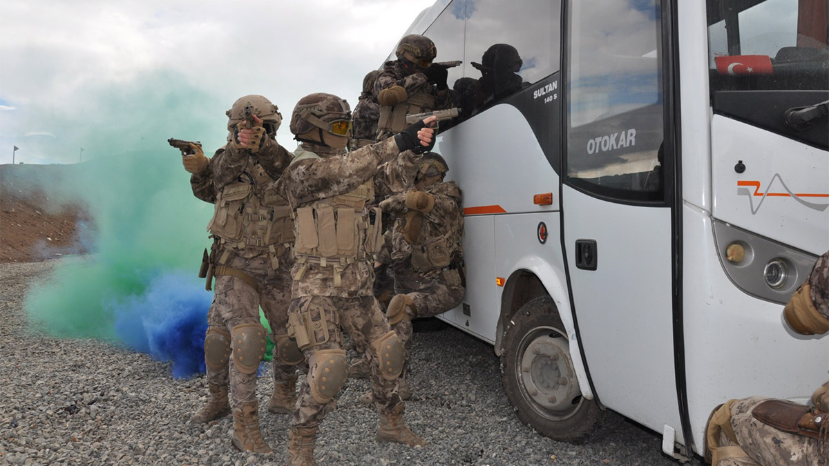 Emniyet birimlerinin özellikle çatışma tehlikesi içeren operasyonlarındaki en önemli gücü olan özel harekat polisleri yıl boyunca eğitimlerini aralıksız sürdürüyor. Senaryo gereği bir midibüste teröristlerin bulunduğu bilgisini alarak yapılan operasyon gösterisi nefes kesti. ‘Ejder’ ve ‘Kirpi’ tipi zırhlı araçlarla tespit edilen araç durduruldu. 5’i kadın toplam 15 kişilik ekip, aracın etrafını sararak aldığı güvenlik sonrası, midibüsteki şüphelileri etkisiz hale getirdi.