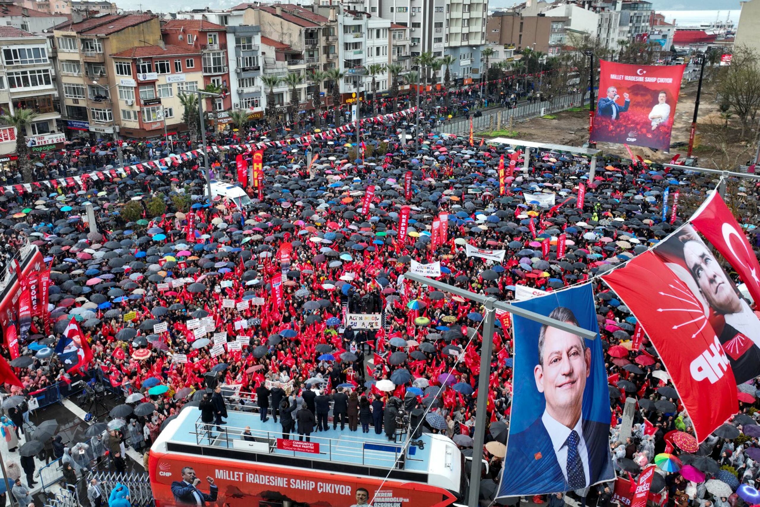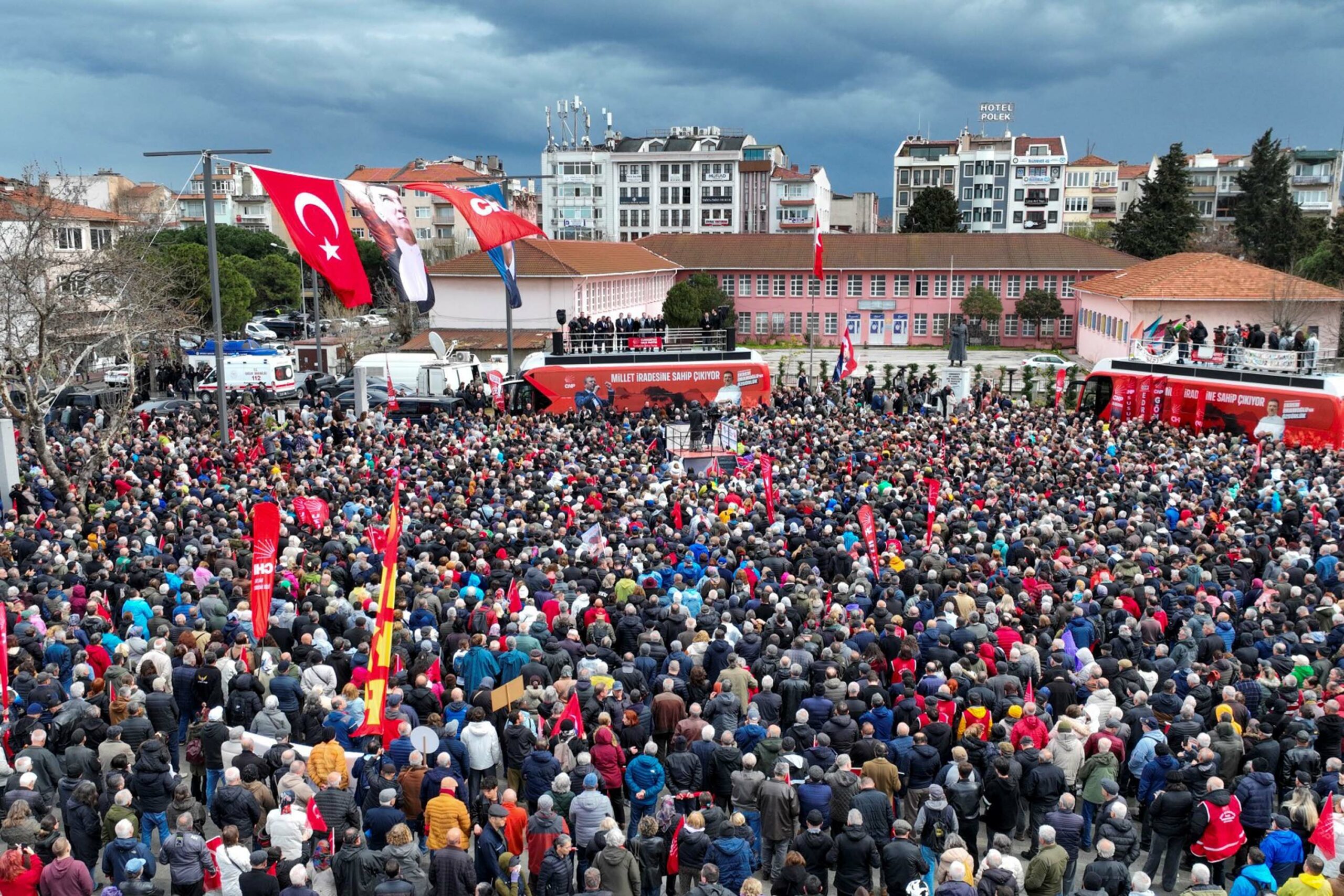 “Kolları sıvamam, kolları sıvamak benim işim değil. Benim işim kolları sıvayacak olanı hapisten çıkarmak. Hazır yağmur durmuş, montu da çıkardık. Şimdi buradan AK Parti’nin, Çanakkale’de AK Parti’ye oy vermiş, partinin seçmeni olan, akşamleyin televizyonu açıp AK Parti‘ye yakın kanalları izleyenlere bir şey söyleyeceğim. Bir senedir neler izlediniz neler… Ne iftiralar, ne hakaretler, ne haysiyet cellatlığı. Sonra ben bir yıl boyunca dedim ki ‘O iddianameyi istiyorum. Yargılanmak için değil, yargılamak için.’ Çünkü biliyordum ki, içinden beni, Ekrem Başkan’ı, arkadaşlarımızı mahcup edecek hiçbir şey çıkmayacak. 4 bin 500 sayfa iddianame çıktı. Peçete gibi bomboş. Buradan AK Parti’nin izlerken ‘Vay vay vay, neler yapmışlar, neler yemişler, ne rüşvetler, ne işler’ diyen, ama iddianame bu hale gelince suskunluğu gören, Tayyip Erdoğan’ın artık iddianame diyemediğini görenlere şunu hatırlatıyorum. Darbe günü TRT’de okunan bildiride TRT diyordu ki ‘560 milyar liralık yolsuzluk.’ 560 kuruşunu ispatlayamadılar. Her gün bir itirafçı mahkemede çıkıp ‘Savcılar zorladı, ben öyle demedim. Dışarı çıkarılma vaadine kanıp o yüzden o imzayı attım’ deyip, arkadaşlarımızdan helallik istiyorlar. Her geçen gün bunlar artarak çoğalıyor. Her gün mahkemede ortaya dökülüyor. İftirayı atan ispatlayamıyor, Sorulan sorulardan kimsenin yüzüne, hakimin dahi yüzüne bakamayacak hale geliyor. Şimdi buradan AK Parti ve MHP’lilere soruyorum. 560 milyar çöp oldu. ‘Bin 200 cep telefonu dağıttılar’ dediler. İddianamede yok. Sorulan gazeteci ‘Beni de kandırmışlar’ dedi. Ekrem İmamoğlu’nun lüks araçlarını gösterdiler. Araçlar MHP’li milletvekilinin çıktı. Ekrem Başkan’ın değil. Yine ‘İBB lojmanında parkenin altından 2 milyon euro para çıktı’ dediler. 2 cent bile çıkmadı. ‘Görüntüsü var’ dediler, görüntüsü yokmuş. Aranmış, parkenin altından taş çıkmış. Bunun da evrakı var. Evrakını iddianameye koymuyor, bulsa koyacak, temiz çıktı koymuyor. Lehe delili saklıyor aleyhte delili koyuyor. AK Partili amcam, MHP’li teyzem. Bunlar Gaziosmanpaşa Belediyesi’ni gösterdiler, belediye başkanının sırtından duvardan gizli kasa çıktı. Beynimden vuruldum. TRT’de gördüm, içinden dolar çıktı. Çılgına döndüm. Dedim ki ‘Hemen gidin arama tutanağını getirin. Kasa nereden çıktı, ne işi var belediyede?’ Dediler ki ‘AK Parti döneminde yapılmış, başkana devir teslimde kalmış.’ ‘İçinden nasıl dolar çıkar?’ Dediler ki ‘İçinden dolar değil mühür çıktı, mühür. Belediyenin mührü.’ ‘Peki o dolar görüntüsü ne?’ dedim. TRT’yi aradı bizim çocuklar. Dediler ki ‘Belediyeyi ararkenki görüntüleri bulamadık, stoktan kullandık. İçinde dolarlı kasa çıktı.’ MHP’li amcam, AK Partili teyzem sana sesleniyorum. O görüntüler yalan çıktı. İddianamenin içinden hiçbirisi çıkmadı. Söylenen, örneğin ‘Çantalarda para var’ dediler. İçinden jammer çıktı. Çantalar boş çıktı. ‘Ekrem İmamoğlu’nun görüntüsü var’ dediler, yalan çıktı. Hiçbiri iddianamede çıkmadı. Yaz boyunca ve sonbahar boyunca, kış boyunca üstünde tepindikleri yalanların hiçbir tanesi iddianamede yok. Onun için şimdi buradayız. Kaçıncı mitingdeyiz? Ne diyordu Erdoğan? ‘Bir ay geçsin birbirlerinin yüzüne bakamayacaklar. İnsan içine çıkamayacaklar.’ Sayın Erdoğan 100’ncü mitingdeyim. Karşımda Çanakkalelilerin yüzü var. Yüzlerine bakarak söylüyorum. Ekrem İmamoğlu masumdur. Tek suçu seni yenmektir. Ant içeriz, yine yenecektir.”