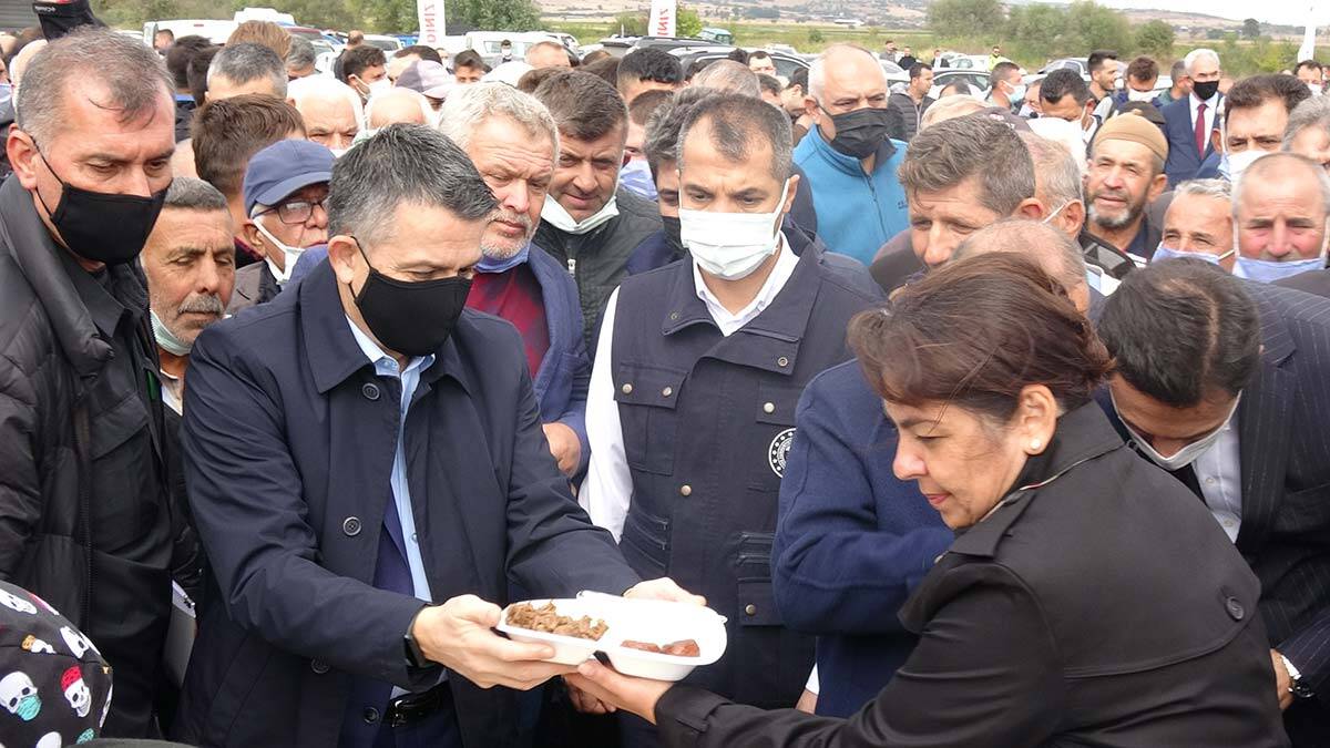 Bakan Pakdemirli, hasadın bereketli olması amacıyla üreticiler tarafından hazırlanan pilav, kavurma ve tatlı ikramının yapıldığı alana gelerek, çiftçilere ikramda bulundu.