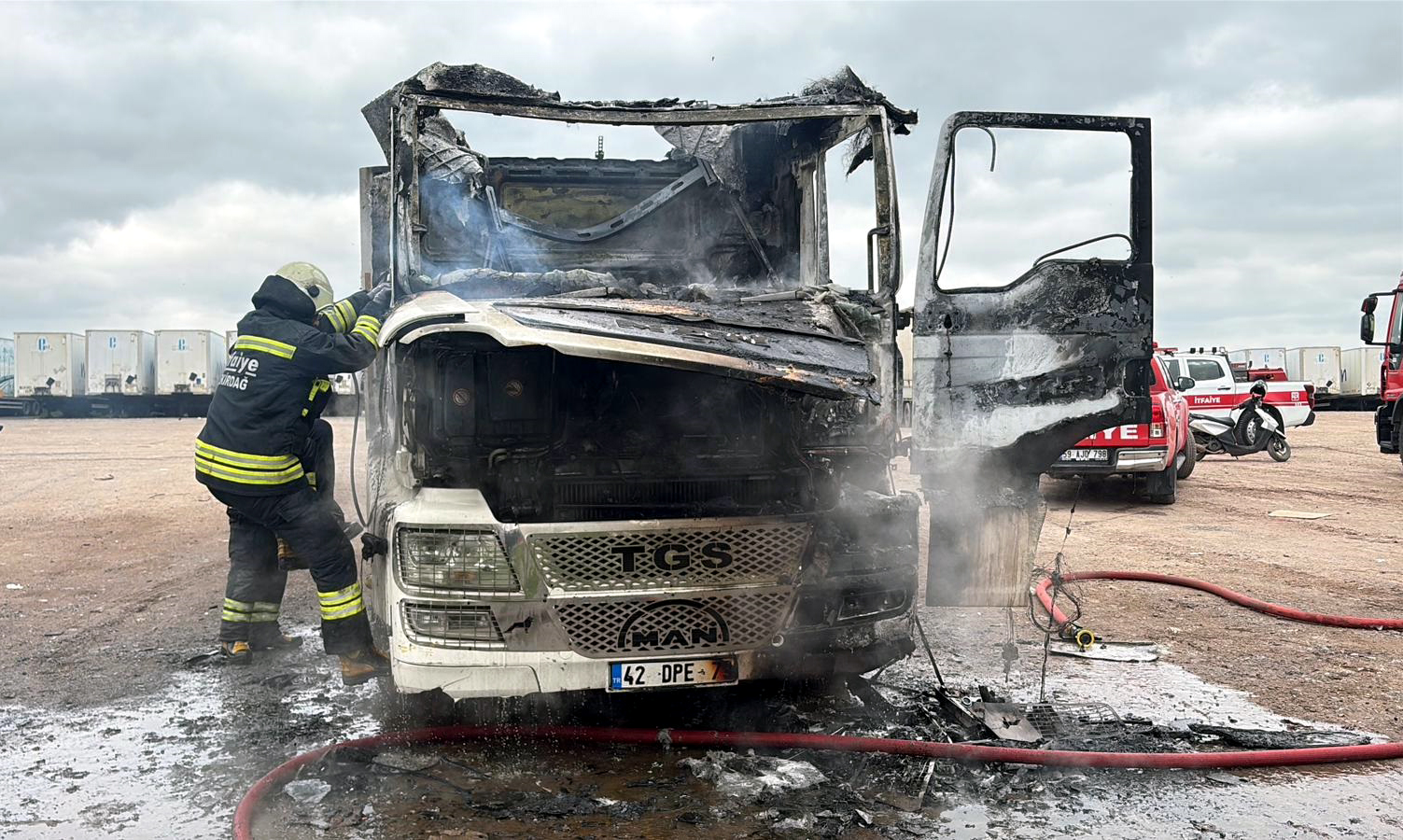 Olay, Hıdırağa Mahallesi Fatih Caddesi’ndeki TIR garajında meydana geldi. 42 Dpe 79 plakalı TIR’ın şoförü Eyüp Oba, aracını park ettikten sonra uyudu. Bir süre sonda iddiaya göre, TIR’ın ısıtma sisteminde yüksek sıcaklık nedeniyle yangın çıktı. Alevleri fark edip kendini araçtan dışarı atan Oba, durumu 112 Acil Çağrı Merkezi’ne bildirdi.