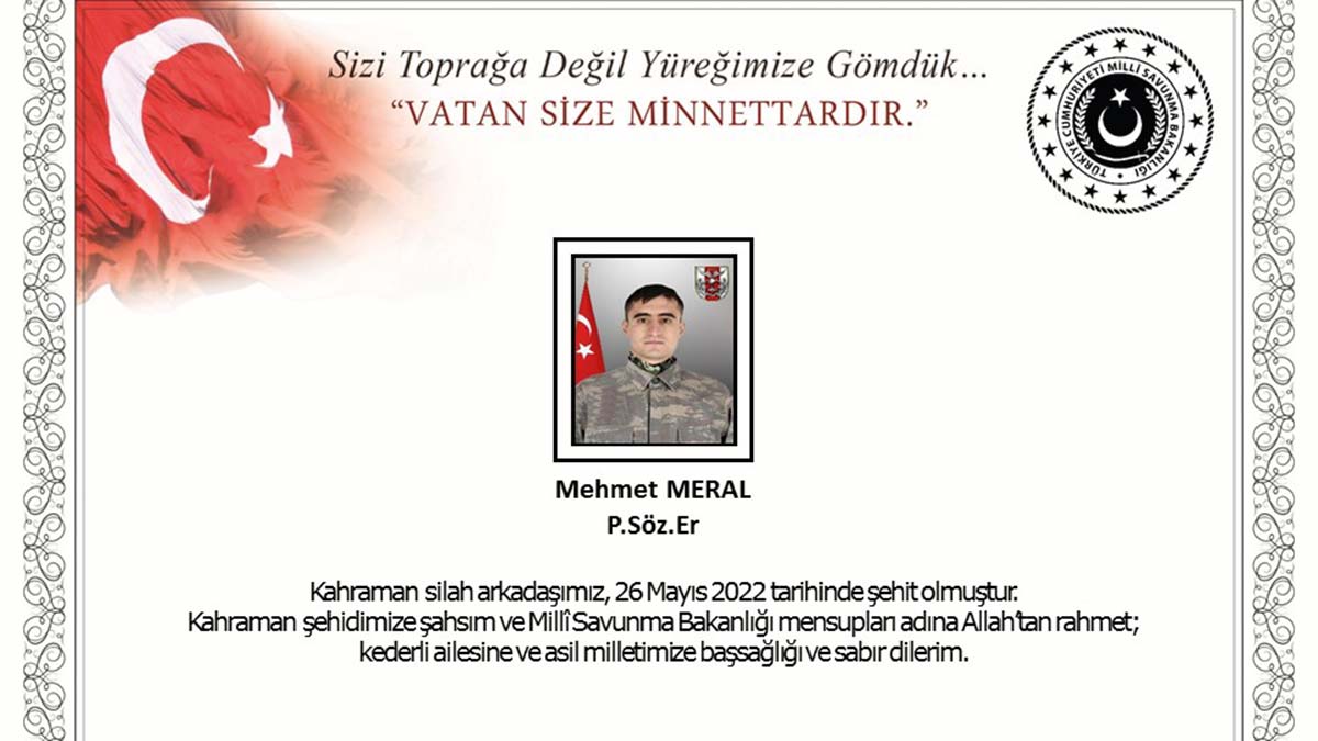 Bakanlıktan yapılan yazılı açıklamada, “Pençe-Kilit Operasyonu bölgesinde 26 Mayıs 2022 tarihinde bir üs bölgemize bölücü terör örgütü mensuplarınca açılan taciz ateşi sonucunda kahraman silah arkadaşımız Piyade Sözleşmeli Er Mehmet Meral şehit olmuştur. Bizleri derin bir acı ve üzüntüye boğan bu olayda hayatını kaybeden aziz şehidimize Allah’tan rahmet, kederli ailesine, Türk Silahlı Kuvvetleri ile asil milletimize başsağlığı ve sabır dileriz” denildi.