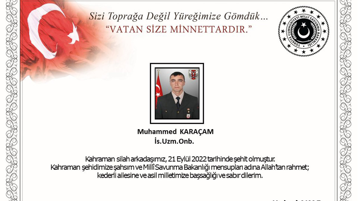 Bakanlıktan yapılan açıklamada, “Pençe- Kilit Operasyonu bölgesinde, 21 Eylül 2022 tarihinde, bir üs bölgemize teröristlerce yapılan taciz atışı sonucunda, kahraman silah arkadaşımız İstihkam Uzman Onbaşı Muhammed Karaçam şehit olmuş, 2 kahraman silah arkadaşımız da yaralanmış ve derhal hastaneye sevk edilerek tedavilerine başlanmıştır. Bizleri derin bir acı ve üzüntüye boğan bu olayda hayatını kaybeden aziz şehidimize Allah’tan rahmet; kederli ailesine, Türk Silahlı Kuvvetleri ile asil milletimize başsağlığı ve sabır, yaralı silah arkadaşlarımıza acil şifalar dileriz” denildi.