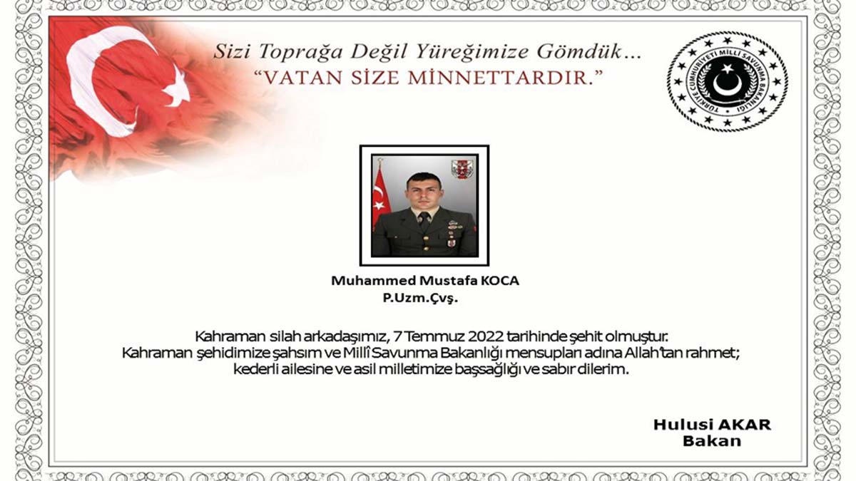 Bakanlıktan yapılan yazılı açıklamada, “Pençe-Kilit Harekatı bölgesinde bir üs bölgemize 07 Temmuz 2022 tarihinde bölücü terör örgütü mensuplarınca açılan taciz ateşi sonucunda 3 kahraman silah arkadaşımız yaralanmış, yaralılarımız derhal hastaneye sevk edilerek tedavilerine başlanmıştır. Yaralılarımızdan Piyade Uzman Çavuş Muhammed Mustafa Koca yapılan tüm müdahalelere rağmen kurtarılamayarak şehit olmuştur. Bizleri derin bir acı ve üzüntüye boğan bu olayda hayatını kaybeden aziz şehidimize Allah’tan rahmet, kederli ailesine, Türk Silahlı Kuvvetleri ile asil milletimize başsağlığı ve sabır, yaralılarımıza da acil şifalar dileriz” denildi.