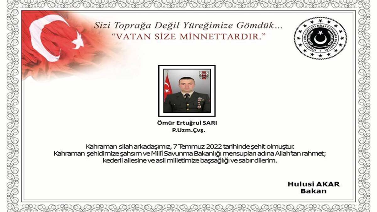 Milli Savunma Bakanı Hulusi Akar, şehit Piyade Uzman Çavuş Ömür Ertuğrul Sarı için taziye mesajı yayımladı. Bakanlığın Twitter’daki hesabından paylaşılan mesajında Akar, “Kahraman silah arkadaşımız, 07 Temmuz 2022 tarihinde şehit olmuştur. Kahraman şehidimize şahsım ve Milli Savunma Bakanlığı mensupları adına Allah’tan rahmet; kederli ailesine ve asil milletimize başsağlığı ve sabır dilerim” dedi.