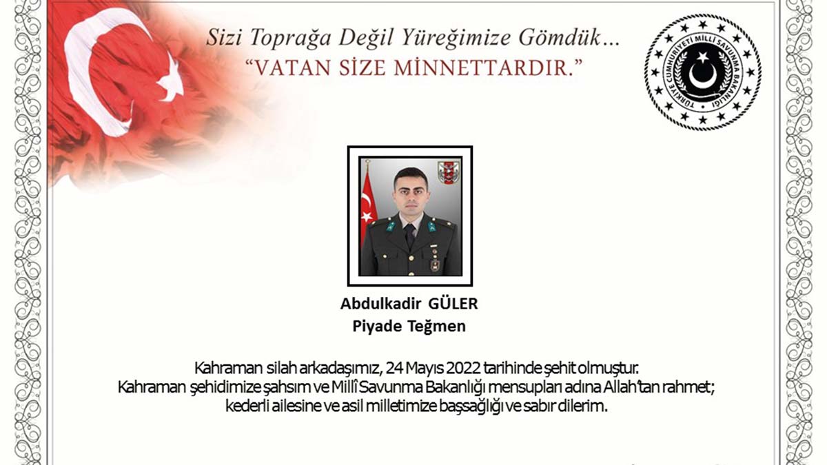 Şehit Güler için bakanlığın Twitter hesabından taziye mesajı yayımlayan Milli Savunma Bakanı Hulusi Akar, “Kahraman silah arkadaşlarımız, 24 Mayıs 2022 tarihinde şehit olmuştur. Kahraman şehitlerimize şahsım ve Milli Savunma Bakanlığı mensupları adına Allah’tan rahmet; kederli ailelerine ve asil milletimize başsağlığı ve sabır dilerim” ifadelerine yer verdi.