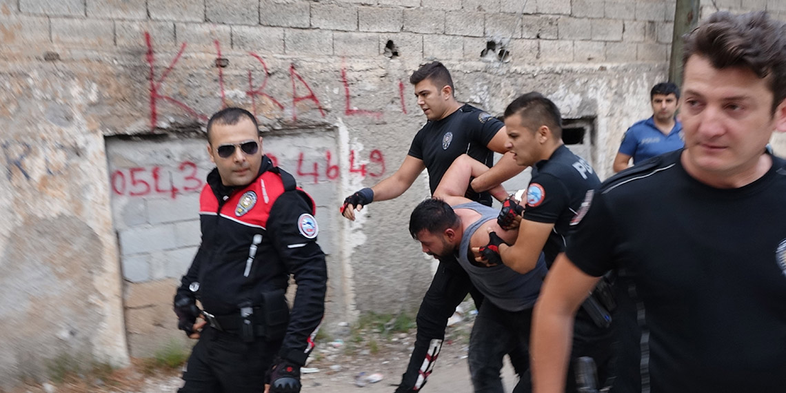 Takviye ekiplerin gelmesi ve evin etrafının sarılmasının ardından polis ekipleri biber gazı sıkarak içeriye girdi. Motosikletli yunus timleri tarafından etkisiz hale getirilen Orbay Çelik, kelepçelenerek ekip aracına bindirildi. Bu sırada polise tepki gösteren mahalleden bazı kişiler, uzaklaştırıldı. Polis merkezine götürülen Orbay Çelik’in, uyuşturucu madde ticareti yapmaktan kesinleşmiş hapis cezası olduğu belirlendi.