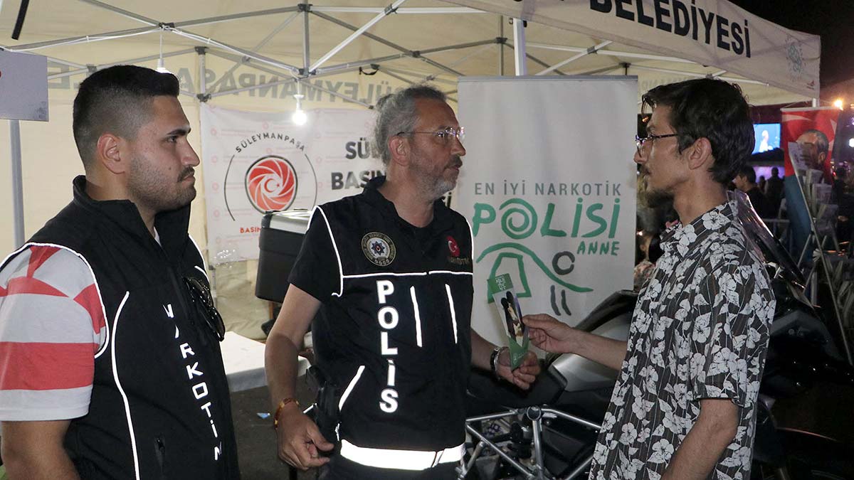 Tekirdağ’da Süleymanpaşa Belediyesi tarafından bu yıl 56’ncısı düzenlenen ve 4 gün süren Uluslararası Kiraz Festivali’nde İl Emniyet Müdürlüğü, vatandaşlara uyuşturucunun zararlarını anlatmak için stant kurdu. Yaklaşık 1000 polis, festival boyunca vatandaşlara ulaşarak uyuşturucunun zararlarını anlattı. Festivalde düzenlenen konserler öncesinde sahneye çıkan Narkotik Suçlarla Mücadele Şube Müdürlüğü ekipleri, gençlere uyuşturucudan uzak durmaları için Emniyet Genel Müdürlüğü tarafından yayınlanan mesajı aktardı. Uyuşturucu maddenin zararları ve mücadelenin önemine değinilen bildiriyi konsere katılanlar ilgiyle dinledi.