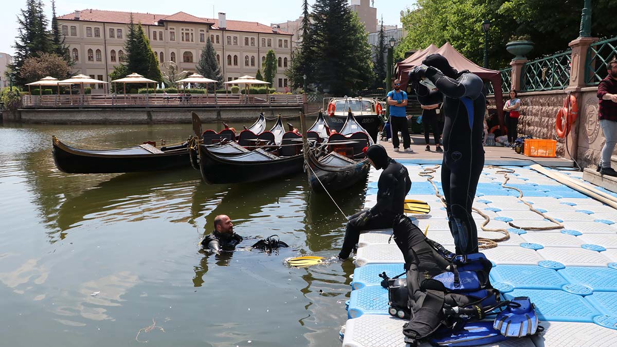 Eskişehir’in en önemli simgelerinden Porsuk Çayı’nda, dalgıçların 10 metrelik alanda 20 dakika süren çalışmasıyla mont, çocuk ayakkabısı, cam şişe, ambalaj ve maskelerin de bulunduğu 3 çuval çöp çıkarıldı.