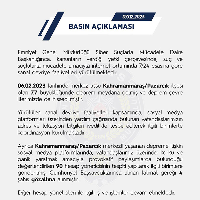 Ayrıca Kahramanmaraş/Pazarcık merkezli yaşanan depreme ilişkin sosyal medya platformlarında, vatandaşlarımız üzerinde korku ve panik yaratmak amacıyla provokatif paylaşımlarda bulunduğu değerlendirilen 90 hesap yöneticisinin tespiti yapılarak ilgili birimlere gönderilmiş, Cumhuriyet Başsavcılıklarınca alınan talimat gereği 4 şahıs gözaltına alınmıştır. Diğer hesap yöneticileri ile ilgili iş ve işlemler devam etmektedir” denildi.