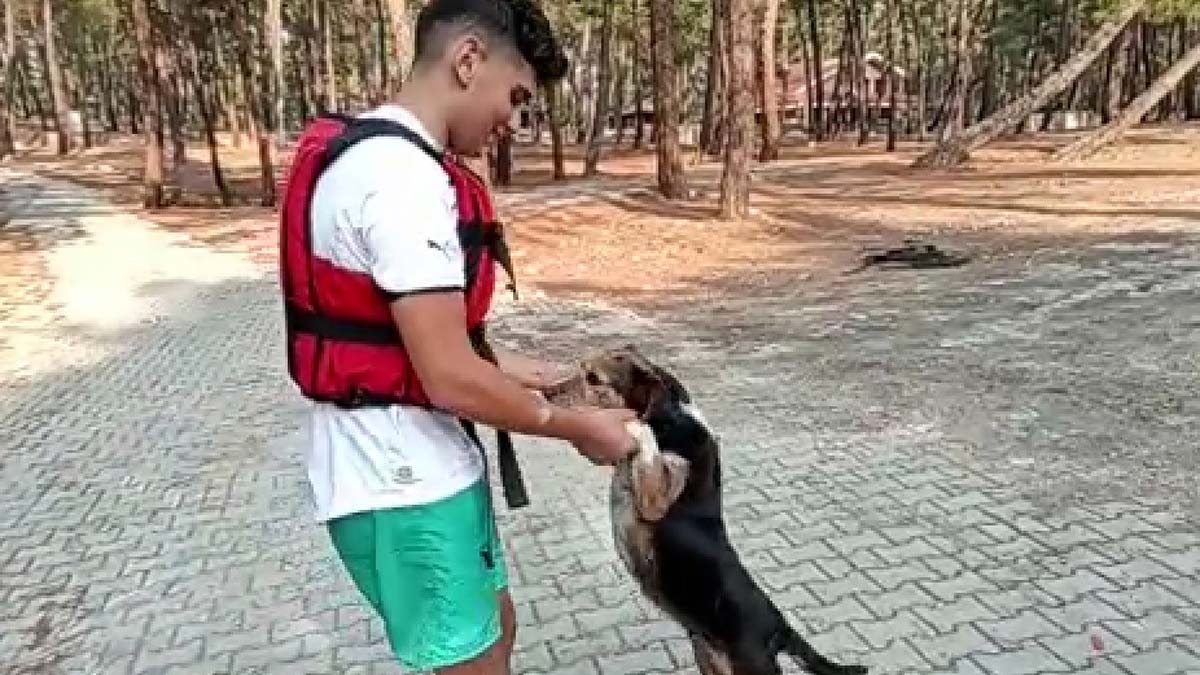 Bursa’nın Orhaneli ilçesinde rafting rehberi Emre Efe Duman (17) derede akıntıya kapılan köpeği kurtardı.