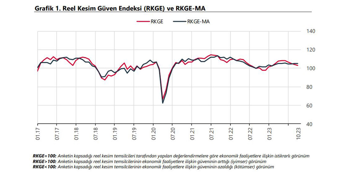 TCMB, Ekim 2023 dönemine ilişkin iktisadi yönelim istatistikleri ve reel kesim güven endeksi verilerini açıkladı. 2023 yılı Ekim ayında İktisadi Yönelim Anketi sonuçları, imalat sanayinde faaliyet gösteren 1727 iş yerinin yanıtlarının ağırlıklandırılıp, toplulaştırılmasıyla elde edildi. Buna göre; mevsimsellikten arındırılmış reel kesim güven endeksi, bir önceki aya göre 0,2 puan artarak 105,3 seviyesinde gerçekleşti.