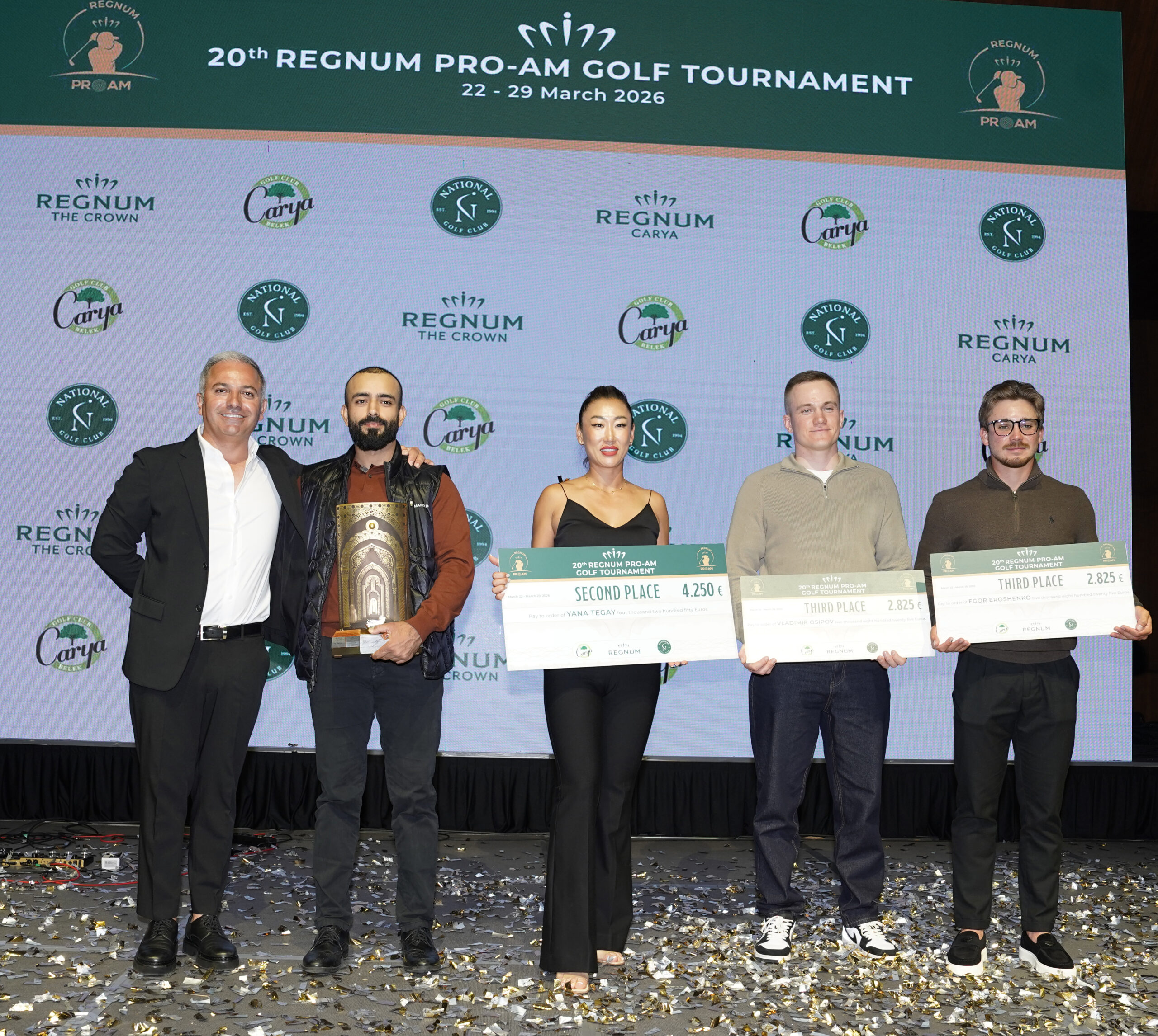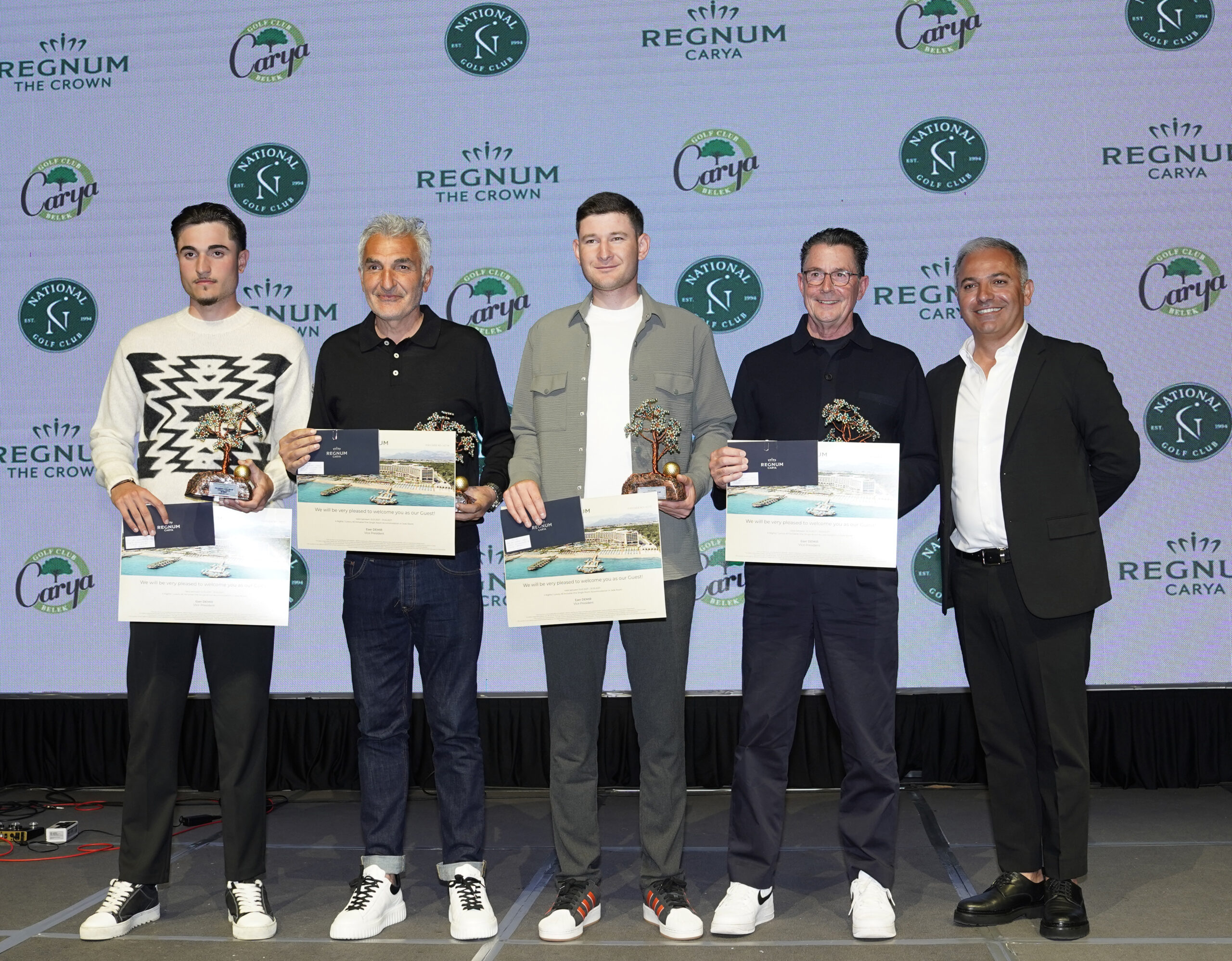 Regnum Carya Otel'de gerçekleşen ödül töreninde, uluslararası turnuvada dereceye girenlere kupa ve hediyelerini Carya Golf Kulübü Müdürü Hasan Ceylan ve National Golf Kulübü Müdürü Şener Ceylan Durmaz takdim etti.