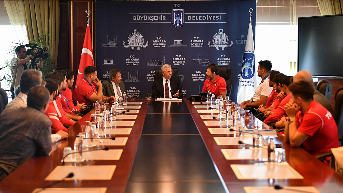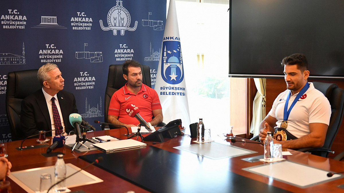 Sırbistan’ın Belgrad kentinde düzenlenen Dünya Güreş Şampiyonası’nda altın madalya kazanan ASKİ Spor’un milli güreşçileri Rıza Kayaalp ve Taha Akgül, Ankara Büyükşehir Belediyesi (ABB) Başkanı Mansur Yavaş’ı makamında kabul etti.