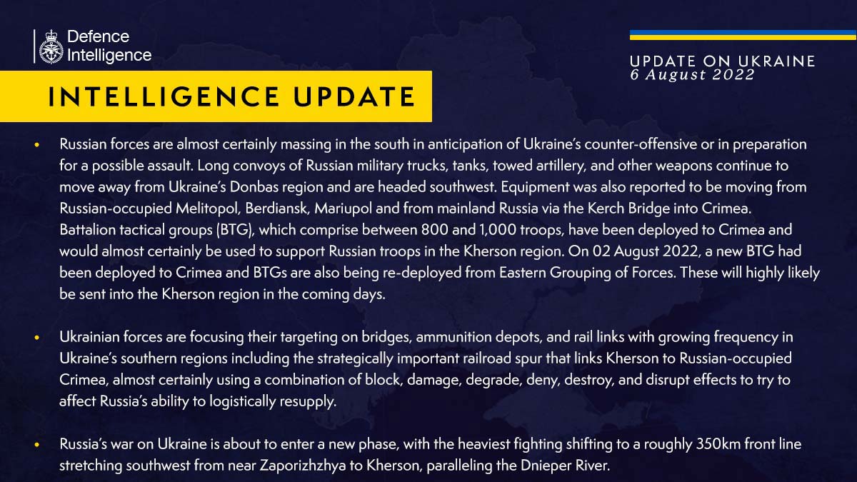 İstihbarat raporunda, Rus kuvvetlerinin, Ukrayna tarafından karşı saldırı beklentisiyle veya olası bir saldırıya hazırlık olarak güneyde toplandığı belirtilerek, “Rus askeri kamyonları, tankları, çekili topçu ve diğer silahlardan oluşan uzun konvoylar, Ukrayna’nın Donbas bölgesinden uzaklaşmaya devam ediyor ve güneybatıya yöneliyor” denildi. Teçhizatın da ayrıca Rus işgali altındaki Melitopol, Berdiansk ve Mariupol’dan ve Rusya anakarasından Kerç Köprüsü üzerinden Kırım’a taşındığı bildirildi.