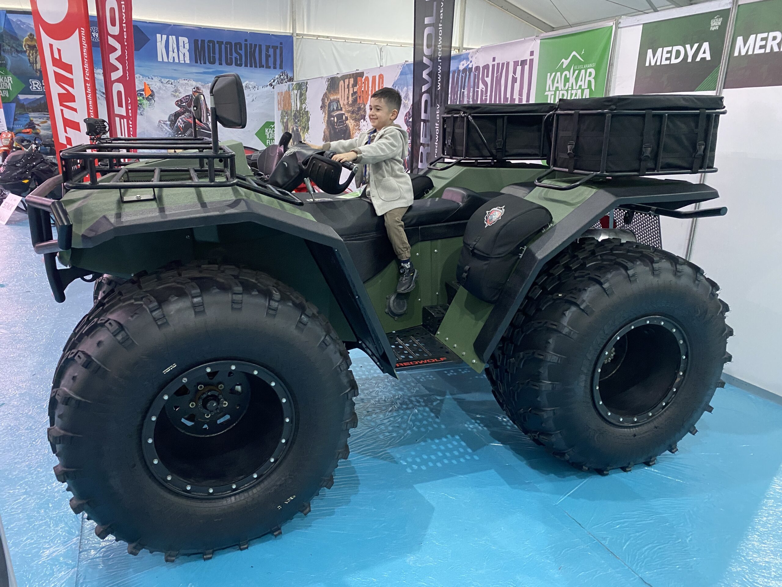 İstanbul’da yaşayan makine mühendisleri Murat Toygar ve Ertan Koşar, 2023 yılında gittikleri Rusya’da yakından görüp, deneyimleme imkanı buldukları dev arazi aracı ATV’yi Türkiye’ye getirmek istedi. İhracatı yasal olarak engellenen ATV’yi ülkeye getiremeyen mühendisler, kolları sıvayarak aynı aracın daha büyüğünü üretmeye karar verdi. 2 mühendis ve 5 tasarımcıdan oluşan ekip, kurdukları atölyede 2 yıl süren yoğun Ar-Ge çalışmasının ardından her türlü zorlu arazi koşulunda gidebilmenin yanında suda da yüzme yeteneğine sahip ATV’yi üretmeyi başardı. Türkiye Motosiklet Federasyonu’nun davetlisi olarak getirildiği Rize’deki Uluslararası Kaçkar Turizm Fuarı’nda görücüye çıkan ‘Red Wolf’ adlı amfibi tipi araç, yoğun ilgi gördü. Fuarda ziyaretçilerinden tam not alan araç, heybetli yapısıyla da dikkatleri çekti.