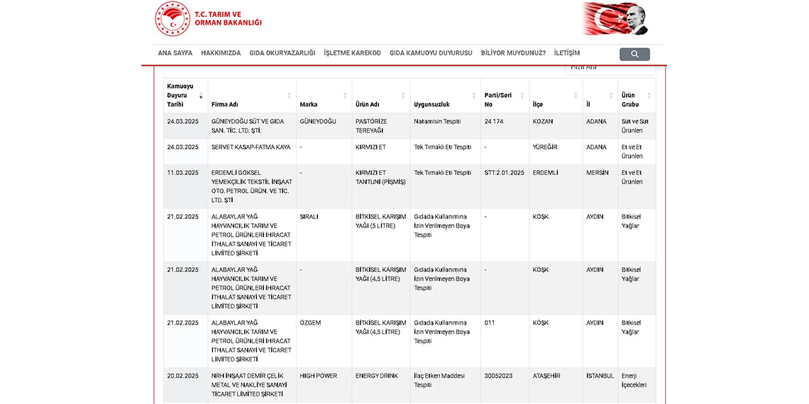 Tarım ve Orman Bakanlığı, gıda ürünlerinde taklit ve tağşiş yapan markaları guvenilirgida.tarimorman.gov.tr internet adresi üzerinden açıklamaya devam ediyor. Sitede ‘Sağlığı Tehlikeye Düşürecek Gıdalar’ ile ‘Taklit ve Tağşiş Yapılan Gıdalar’ başlıkları altında taklit ve tağşiş yaparak sağlığı tehlikeye düşüren firmalar, markalar ve ürünler yer alıyor. Yayınlanan listeye 2’si sağlığı tehlikeye düşürecek ürün olmak üzere toplam 27 yeni ürün daha eklendi. Listede, tereyağından siyah çaya, kırmızı etten beyaz peynire birçok ürün yer aldı.