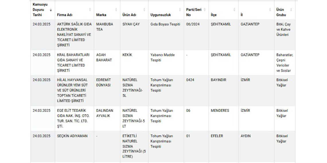 Listeye göre, denetlemeler sonucunda Adana’nın Yüreğir ilçesinde faaliyet gösteren bir kasabın kırmızı etlerinde tek tırnaklı eti tespit edildi. Bunun yanı sıra zeytinyağı üretimi yapan 3 firmanın ürünlerine tohum yağlarının karıştırıldığı belirlendi. Gaziantep’in Şehitkamil ilçesinde üretim yapan bir firmanın siyah çaya gıda boyası karıştırdığı ortaya çıktı.