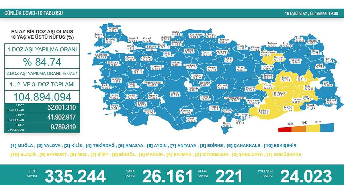 En yüksek aşılama oranına sahip iller; Muğla, Yalova, Kilis, Tekirdağ, Amasya, Aydın, Antalya, Edirne, Çanakkale ve Eskişehir olurken en düşük aşılama oranına sahip iller ise Elazığ, Bayburt, Muş, Siirt, Bingöl, Mardin, Batman, Diyarbakır, Şanlıurfa ve Gümüşhane oldu.