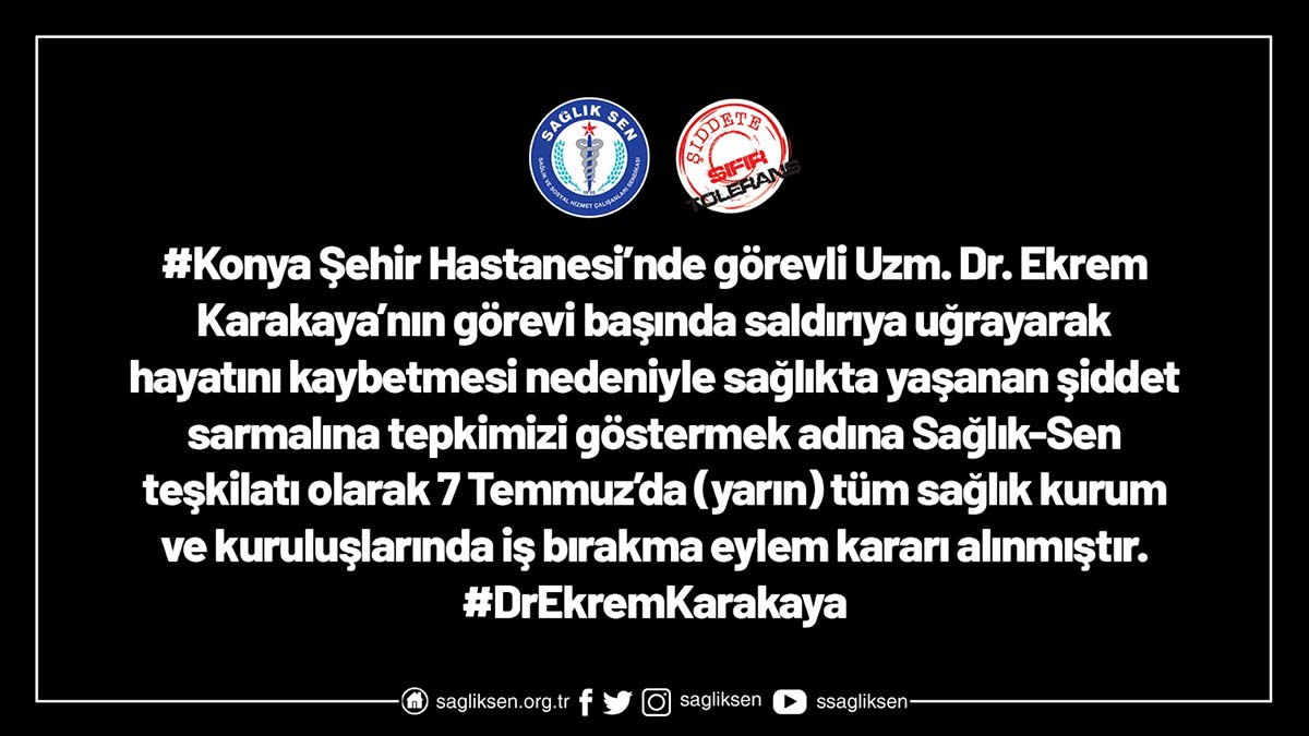 SAĞLIK-SEN’den yapılan açıklamada, “Sağlık çalışanları olarak tüm Türkiye’de iş bırakıyoruz. Konya Şehir Hastanesi’nde görevli Uzman Doktor Ekrem Karakaya’nın görevi başında canice katledilmesi nedeniyle Sağlık-Sen olarak 7 Temmuz’da tüm sağlık kurum ve kuruluşlarında iş bırakıyoruz” denildi.