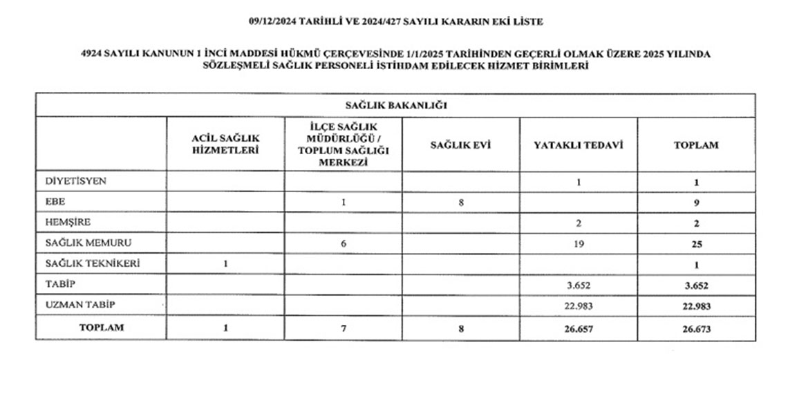 Cumhurbaşkanı Recep Tayyip Erdoğan’ın imzası ile Resmi Gazete’de yayımlanan karara göre; eleman temininde güçlük çekilen yerlerde ve hizmet dallarında sağlık hizmetlerinin etkili ve verimli bir şekilde yürütülebilmesi amacıyla sözleşmeli sağlık personeli istihdam edilmesine 10/07/2003 tarihli ve 4924 sayılı kanunun 1’inci maddesi gereğince karar verildi. Yayımlanan karara istihdam edilecek sözleşmeli sağlık birimi personel birimleri şu şekilde;