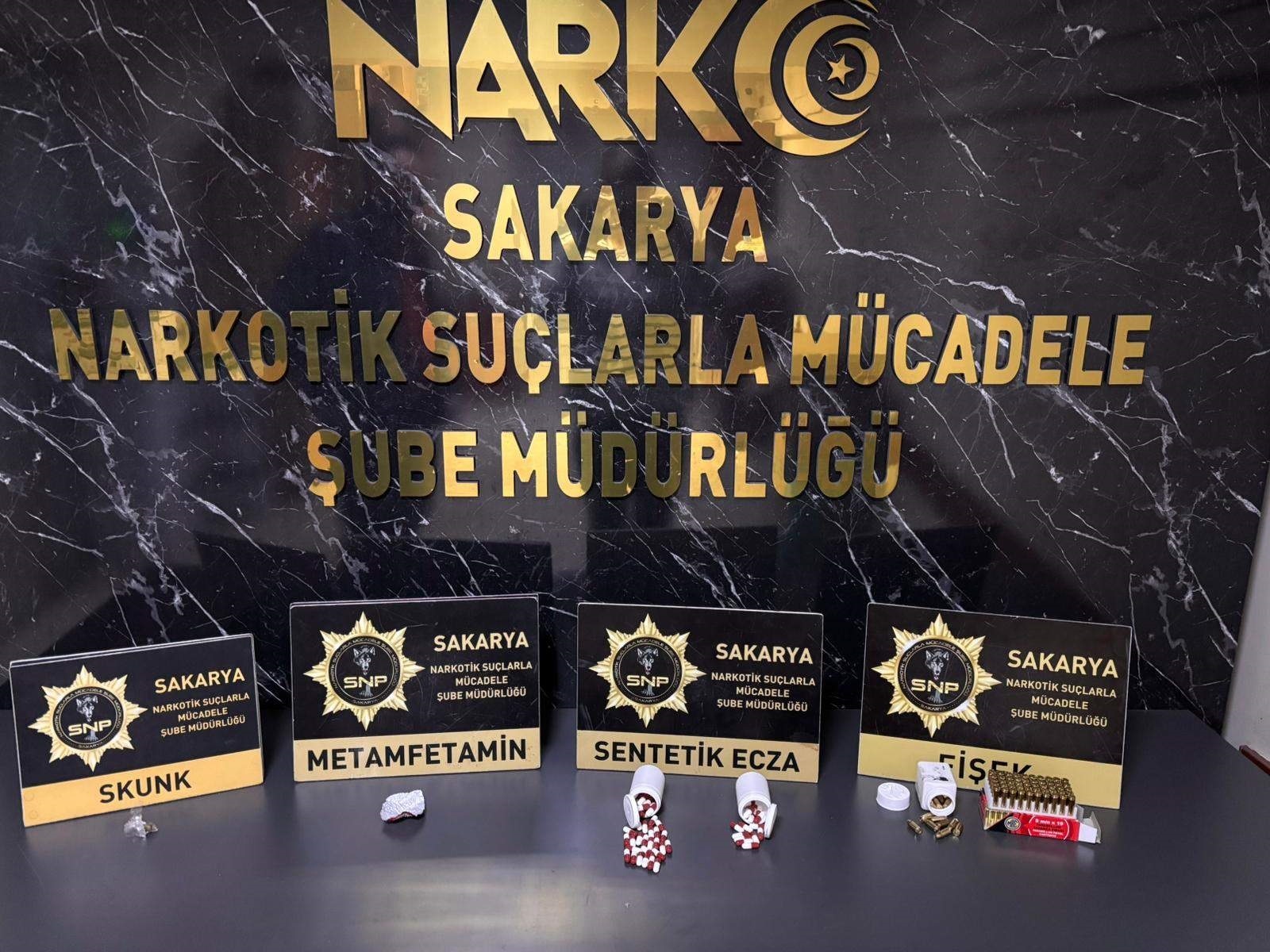 Sakarya Cumhuriyet Başsavcılığı koordinesinde, İl Emniyet Müdürlüğü Narkotik Suçlarla Mücadele Şube Müdürlüğü ekipleri, uyuşturucu ticareti yaptığı belirlenen şüphelilerin adreslerine operasyon düzenledi. Operasyonda B.B. (24), İ.K. (22), O.D. (28), Ş.A. (33) ve T.D.C. (29), gözaltına alındı. Şüphelilerin adreslerinde yapılan aramalarda; 107 adet sentetik ecza, 14 gram metamfetamin, 0,34 gram skunk, 1 hassas terazi, uyuşturucu paketlemede kullanıldığı değerlendirilen materyaller ile 67 adet ruhsatsız tabanca fişeği ele geçirildi. Öte yandan şüphelilerden O.D.'nin 'Silahlı tehdit’, ‘6136 sayılı kanuna muhalefet’ ve 'Tutuklu ve hükümlünün kaçması' suçlarından 6 yıl 7 ay kesinleşmiş hapis cezasıyla arandığı, T.D.C.'nin de ‘Kullanmak için uyuşturucu madde bulundurmak’ suçundan 1 yıl 8 ay kesinleşmiş hapis cezası bulunduğu tespit edildi.